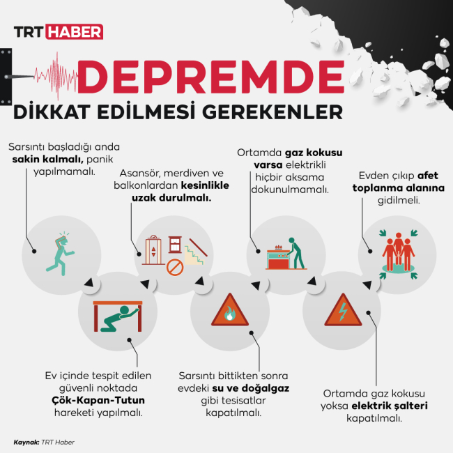 “Depreme dışarıda yakalananlar elektrik direkleri, binaların dış cepheleri, çatı ve bacalarından uzak durmaya özen göstermeli. Onların düşme olasılığını göz önünde bulundurmalı, çevresi açık alanlara gitmeli. Stadyum, ibadethane, tiyatro salonu, konser alanı, toplu taşıma gibi kalabalık yerlerde ise izdiham faktörü var. Buralarda da sakin kalıp bulunulan yerde kapanmak en doğrusu olacak. Panik halinden uzak durmak, izdihama yol açmamak gerekir.”