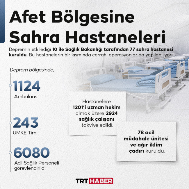 Açıklamasında, "10 ilimizde 77 sahra hastanesi kurduk. Acil sağlık hizmeti verilen bu hastanelerin bir kısmında cerrahi operasyonlar da yapabiliyoruz. Sağlık durumu riskli depremzedelerimiz buralarda yapılan ilk müdahalenin ardından helikopterlerle bölgedeki hastanelere sevk ediliyor" dedi.