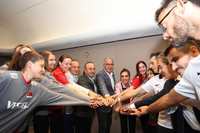 [Fotoğraf: İHA]Çavuşoğlu, Twitter hesabından yaptığı paylaşımda, "Önünüzde kupalar, arkanızda milyonlar var. Belgrad’daki yarı final öncesi Filenin Sultanları’yla buluştuk. 84 milyonun yüreğindeki heyecanı kendilerine ilettik" ifadelerini kullandı.