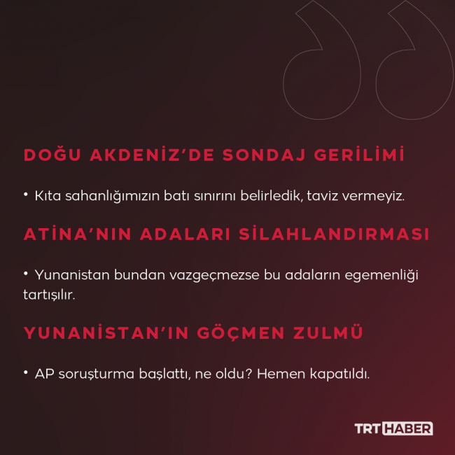 Biz kıta sahanlığımızın batı sınırlarını da belirledik, Bileşmiş Milletler'e kaydını yaptırdık. Buradan taviz vermemiz söz konusu değildir. Bu sınırlar çerçevesinde de Libya ile Deniz Yetki Alanları anlaşmasını imzaladık onu da BM'ye gönderdik. Son bir yıl içinde Rum tarafı ve Yunanistan 9 defa kıta sahanlığımızı ihlal etmek istedi. Üçüncü ülke bayraklı gemileri çeşitli sebeplerle buraya sokmak istedi. Biz bazılarını diplomatik yolla engelledik. Sonuç itibarıyla bazılarını bu girişimlerimizden dolayı engelledik, bazılarını da sahada gerekli Deniz Kuvvetlerimiz tedbirlerini alıyor. Gemilerimiz gerekli uyarıları yaparak kıta sahanlığımıza hem güneyde hem de batıda bu gemileri biz sokmadık. Kararlılığımız açık nettir. Burada ancak Türkiye ile iş birliği yaparsanız olabilir. Bilimsel araştırma mı? Türkiye'den izin alırsanız olabilir. Son zamanlarda ülkelerin doğrudan bizden almaya başlaması da önemli. Bizim kıta sahanlığımızı tanımaları anlamına geliyor. Yunanistan'ın ve Rum kesiminin kıta sahanlığımızı ihlal etme amacıyla o gemileri yönlendiriyorlar buna alet olmamaları gerekiyor. Bu konuda tutumumuz hiç bir zaman değişmez. Kıta sahanlığımızı savunacak güçte ve kararlılıktayız.