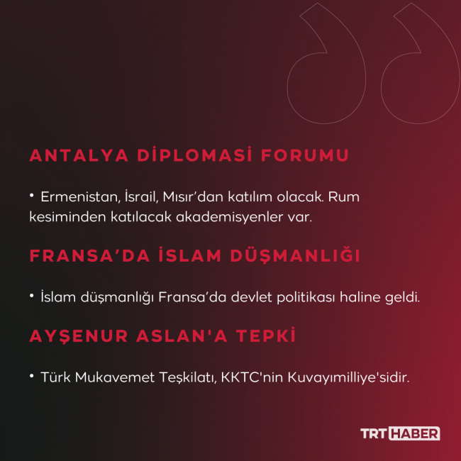 Bir gün öncesinde de Ara Buluculuk İstanbul Konferansı'nı Antalya'da gerçekleştireceğiz, büyük olasılıkla ASTANA Dışişleri Bakanları toplantısını da gerçekleştireceğiz. Rusya teyit etti, İran'dan şu anda haber bekliyoruz. Antalya Diplomasi Forumu tüm herkesin katılımı ile birçok alanda her şeyin tartışılmasına bir zemin hazırlıyor. O yüzden de herkesi davet ediyoruz. Ermenistan'dan da, İsrail'den de, Mısır'dan da, Yunanistan'dan da, Rum kesiminden de katılacak gazeteci, akademisyenler var. KKTC'den de var. Herkesin sesi burada duyulsun istiyoruz. Deniz yetki alanlarından bahsediyoruz ya Doğu Akdeniz, tüm dünyada bu tartışmalı bir konu barışçıl yoldan bu sorunların nasıl çözülebileceğini de tartışacağız Antalya Diplomasi Forumu'nda.