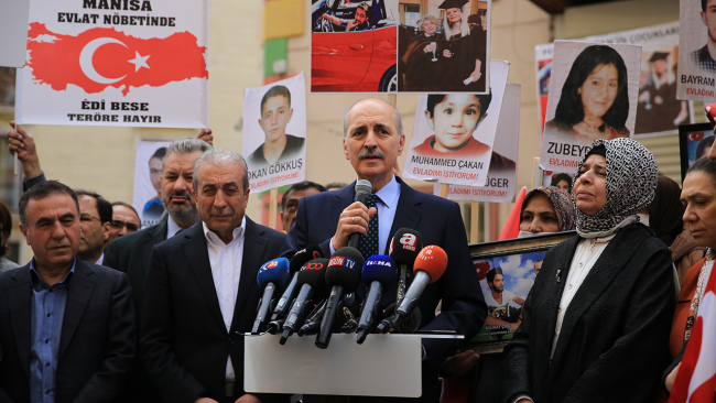 AK Parti Genel Başkanvekili Numan Kurtulmuş, Diyarbakır annelerinin oturma eylemine ilişkin, "Bu aileler burada haklı olarak dünyanın gözü önünde evlatlarını arıyorlar. 'Evlatlarımızı geri verin.' diyerek burada dağla irtibatlı olduğunu gördükleri, düşündükleri insanlara sesleniyorlar. Ümit ediyorum ki; evlatlarımızın hepsi dağdan kurtarılarak, örgütün elinden Türkiye'ye getirilerek burada hayatlarına kavuşturulacaklardır." dedi.