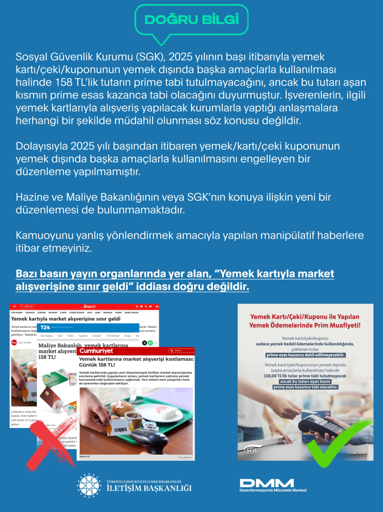 "İşverenlerin, ilgili yemek kartlarıyla alışveriş yapılacak kurumlarla yaptığı anlaşmalara herhangi bir şekilde müdahil olunması söz konusu değildir. Dolayısıyla 2025 yılı başından itibaren yemek kartı, çeki veya kuponunun yemek dışında başka amaçlarla kullanılmasını engelleyen bir düzenleme yapılmamıştır. Hazine ve Maliye Bakanlığının veya SGK'nın konuya ilişkin yeni bir düzenlemesi de bulunmamaktadır."
