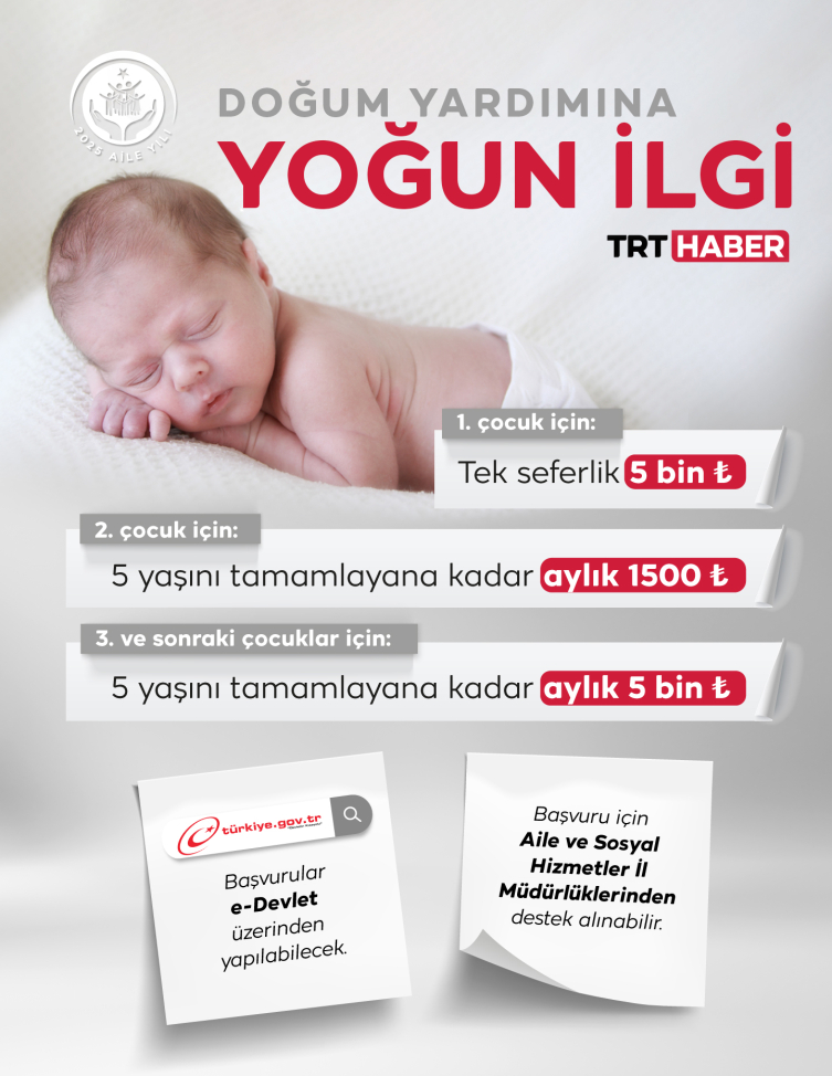 Bakan Göktaş, 1 Ocak 2025 itibarıyla doğan ilk çocuğa 5 bin lira tek seferlik, ikinci çocuğa aylık 1500 lira, üç ve sonraki çocuklar için aylık 5 bin lira destek verileceğini hatırlattı.