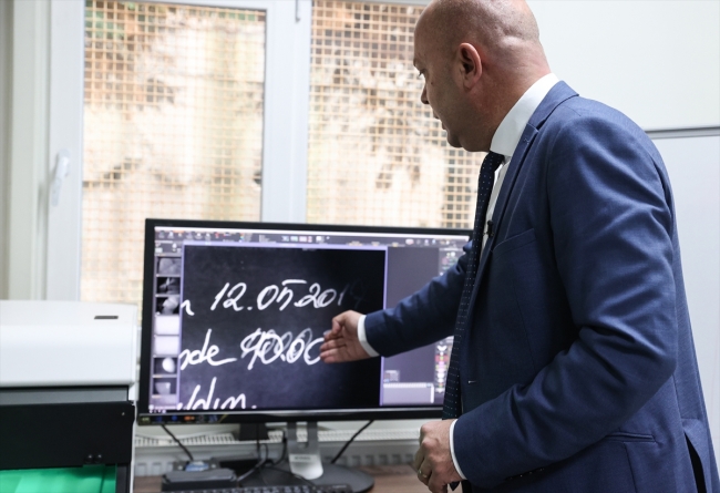 Adli belge inceleme laboratuvarında uzmanlık yapan Nilüfer Şeyda Dursun, çeşitli ışık dalgalarıyla evraklardaki sahtecilik amaçlı değişiklikleri gösteren, dünyanın sayılı laboratuvarında bulunan cihazda hazırlanan örnek evrakları gösterdi.