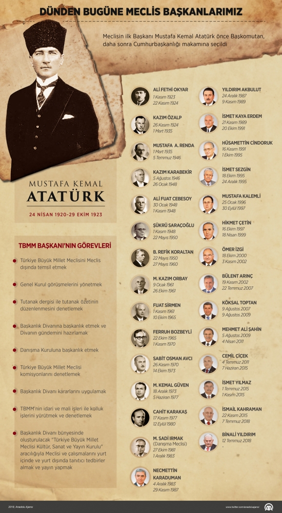 Mustafa Kemal Atatürk (1881-1938), 24 Nisan 1920-29 Ekim 1923 tarihleri arasında TBMM Başkanlığı yaptı.
