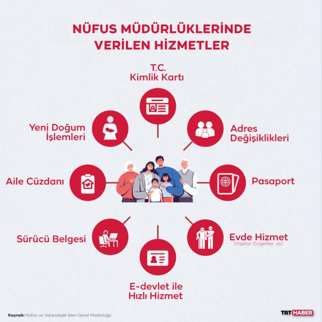 Türkiye’nin 81 ilinde ve 975 ilçesinde nüfus müdürlükleri vatandaşa hizmet için çalışıyor. Verilen hizmet doğum kaydı ile başlayıp ölümle beraber kütükten düşürme işleminin yapılmasına dek sürüyor.