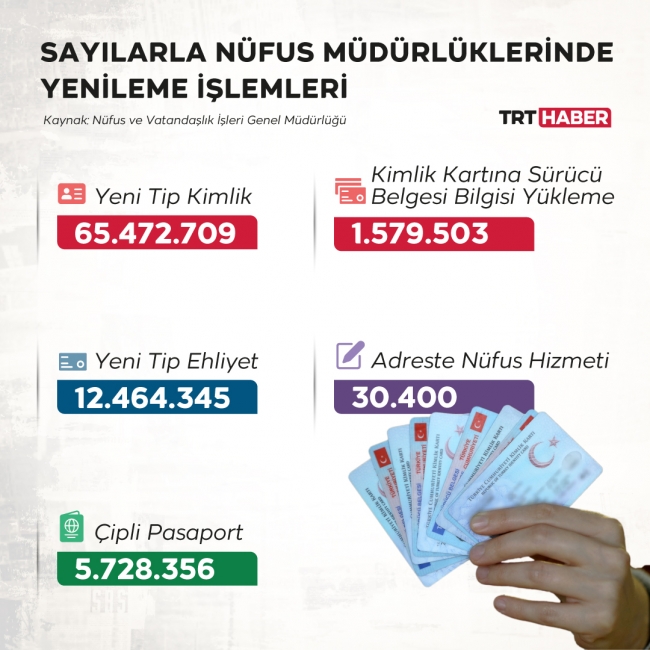 Nüfus ve Vatandaşlık İşleri Genel Müdürlüğü tüm bu hizmetlerin yanında halihazırda kullanılan belgeleri de yenilemeye devam ediyor. Müdürlük tarafından 65 milyon 472 bin 709 kimlik kartı, 12 milyon 464 bin 345 sürücü belgesi ve 5 milyon 728 bin 356 pasaport yenilendi.