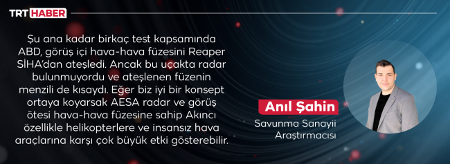 “Şu ana kadar birkaç test kapsamında ABD, görüş içi hava-hava füzesini Reaper SİHA’dan ateşledi. Ancak bu uçakta radar bulunmuyordu ve ateşlenen füzenin menzili de kısaydı.