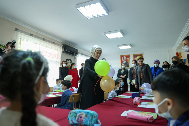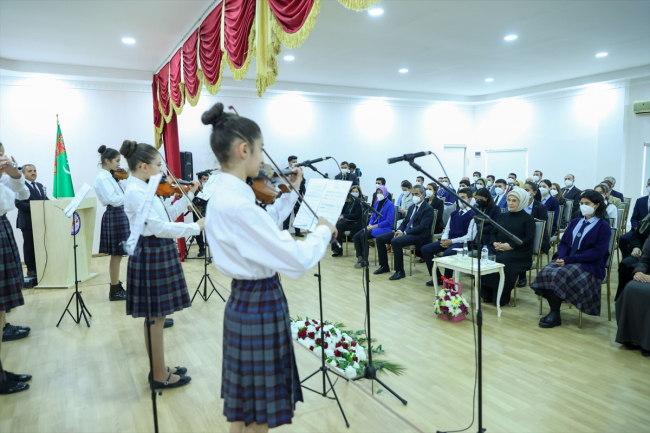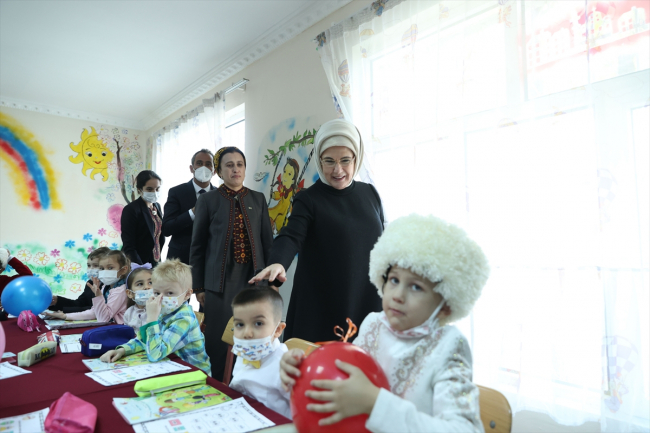 Ziyarette, Emine Erdoğan'ı Türkmen-Türk Okulu öğrencileri çiçeklerle karşıladı. Öğrenciler Erdoğan için kısa bir de müzik dinletisi sundular.