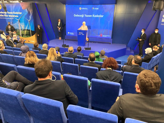 Emine Erdoğan, Turkcell, Türkiye Odalar ve Borsalar Birliği (TOBB) ile TOBB Kadın Girişimciler Kurulu iş birliğinde Turkcell Küçükyalı Plaza Konferans Salonu'nda düzenlenen Geleceği Yazan Kadınlar Projesi'nin İklim Fikir Maratonu Ödül Töreni'ne katıldı.