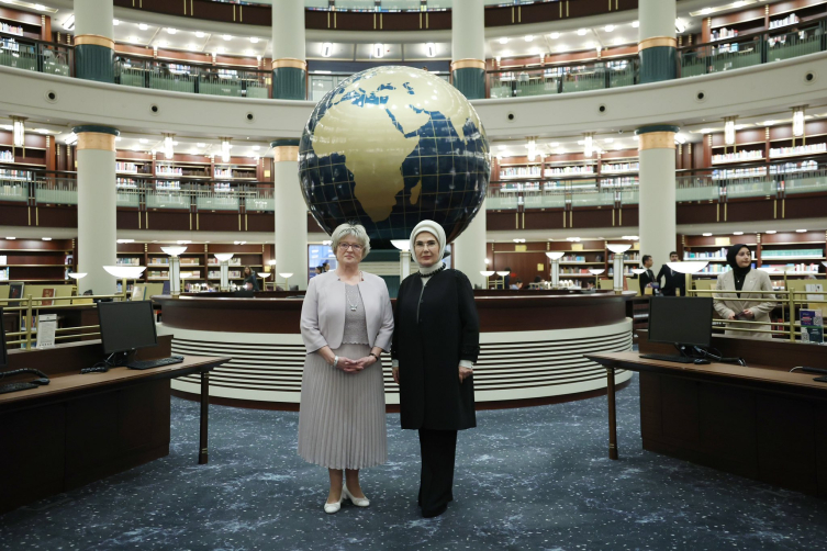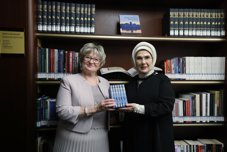 Cumhurbaşkanı Erdoğan'ın eşi Emine Erdoğan, Macaristan Cumhurbaşkanı Tamas Sulyok'un eşi Zsuzsanna Nagy ile Cumhurbaşkanlığı Millet Kütüphanesi'ni ziyaret etti. Emine Erdoğan, Nagy'yi kütüphanenin girişinde samimi şekilde karşıladı.
