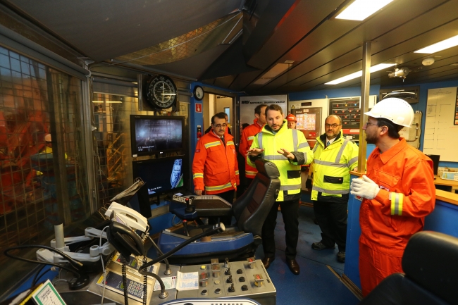 Enerji ve Tabii Kaynaklar Bakanı Berat Albayrak, İzmit'te demirli bulunan Türkiye'nin ilk sondaj gemisinde incelemelerde bulundu.