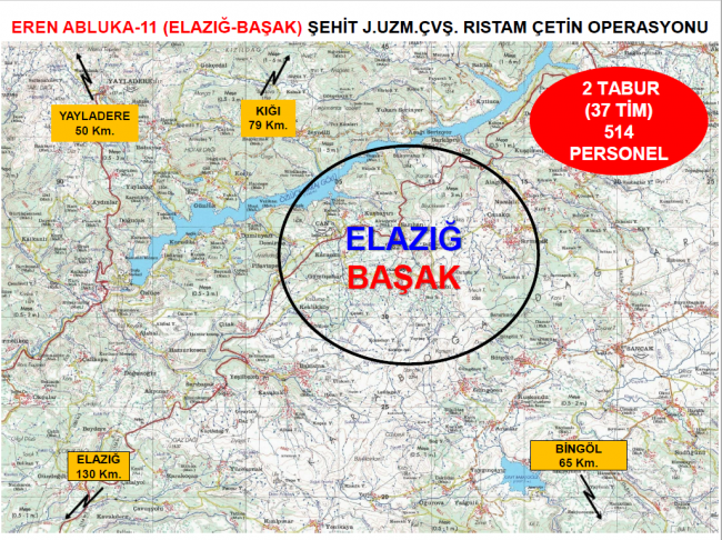 Terör örgütü PKK'yı ülke gündeminden çıkarmak ve bölgede barındığı değerlendirilen teröristleri etkisiz hale getirmek maksadıyla, Elazığ'da "Eren Abluka-11 (Elazığ-Başak) Şehit Jandarma Uzman Çavuş Rıstam Çetin Operasyonu başlatıldı.