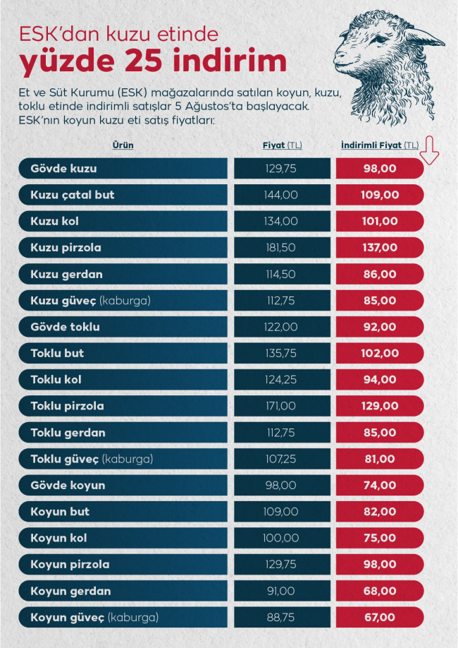 Kampanya kapsamında ESK mağazalarında satılan koyun, kuzu, toklunun kilogram eti satış fiyatında yüzde 25'e varan indirim yapıldığı belirtilerek, "Gövde kuzu 129,75 liradan yüzde 25 indirimle 98 liraya, kuzu pirzola 181,5 liradan 137 liraya, kuzu gerdan 114,50 liradan 86 liraya satılacak" denildi.