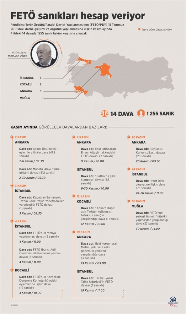 Kasım ayında 4 ilde sanık sayılarıyla öne çıkan ve örgütün bazı kilit isimlerinin yargılandığı 14 dava görülecek. "Anayasal düzeni ortadan kaldırmaya teşebbüs etme", "silahlı terör örgütüne üye olma" ve "nitelikli yağma" gibi suçlardan açılan davalarda 1255 sanık yargılanacak.