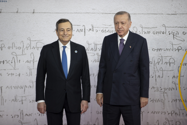 Draghi, Cumhurbaşkanı Recep Tayyip Erdoğan'ın da aralarında bulunduğu konuklarını tek tek kapıda karşıladı.