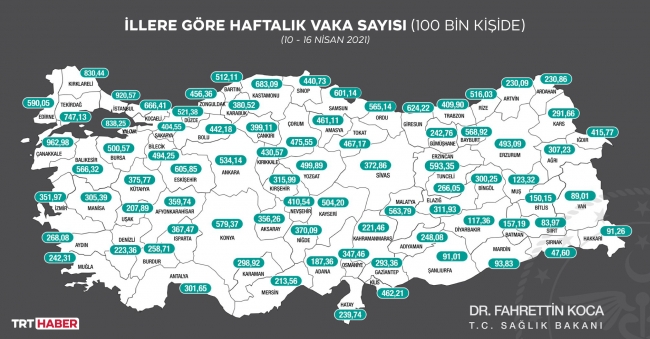 İllere göre haftalık vaka sayısı, her 100 bin kişide İstanbul'da 920,57, Ankara'da 534,14, İzmir'de 351,97 oldu.
