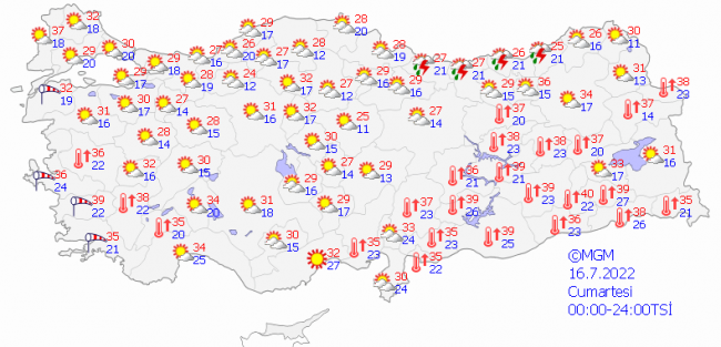 Hafta sonu yurdun tamamına yakınında yağış beklenmezken, en yüksek sıcaklık değerlerinin Ankara'da 30-32, İstanbul'da 29-31, İzmir'de 36-38, Antalya'da 34-36, Diyarbakır'da 39-42, Samsun'da 25-28, Adana'da 34-35, Erzurum'da 34-35 olması bekleniyor.