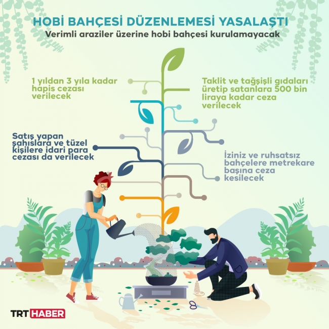 Düzenlemeyle birlikte, verimli araziler üzerine hobi bahçesi kurulamayacak. Verimli arazileri satanlara 1 yıldan 3 yıla kadar hapis cezası verilecek.