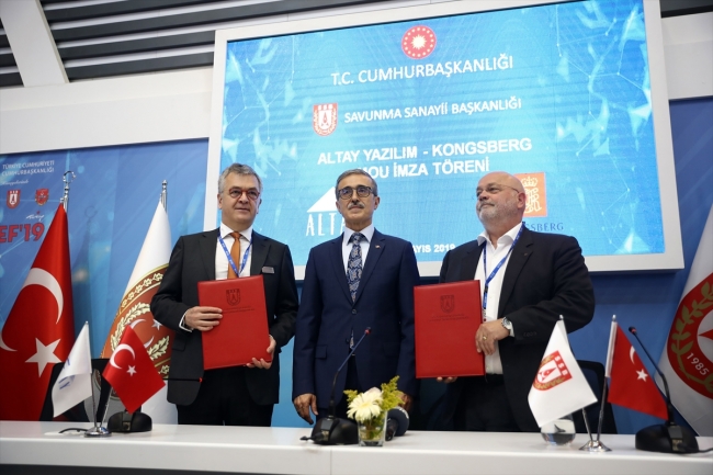 Altay Yazılım ile Norveçli Kongsberg firması arasında iş birliği protokolü imza töreni, SSB Başkanı Prof. Dr. İsmail Demir, Altay Yazılım AŞ Yönetim Kurulu Başkanı Murad Dural, Kongsberg Güdümlü Mermiler ve Pazarlamadan Sorumlu Başkan Yardımcısı Hans Kongelf’in katılımıyla yapıldı.