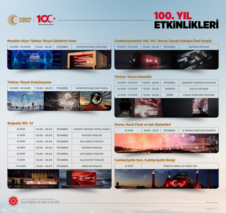 Açıklamada, "Başkanlık olarak yurt genelinde hazırladığımız özel etkinlikler, dijital sergiler ve üç boyutlu gösteriler vatandaşlarımızla buluşuyor, özel ışık gösterilerinin yapıldığı tarihi mekanlarda 100. Yıl Marşımız yankılanıyor" ifadelerine yer verildi.