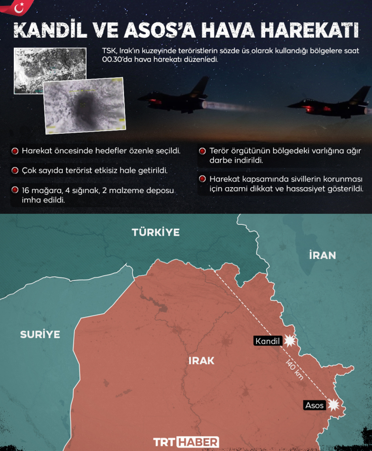 Milli Savunma Bakanlığı, Irak'ın kuzeyindeki Kandil ve Asos’ta bulunan ve teröristler tarafından sözde üs olarak kullanılan bölgelere 00.30'da hava harekatı icra edildiğini duyurdu.