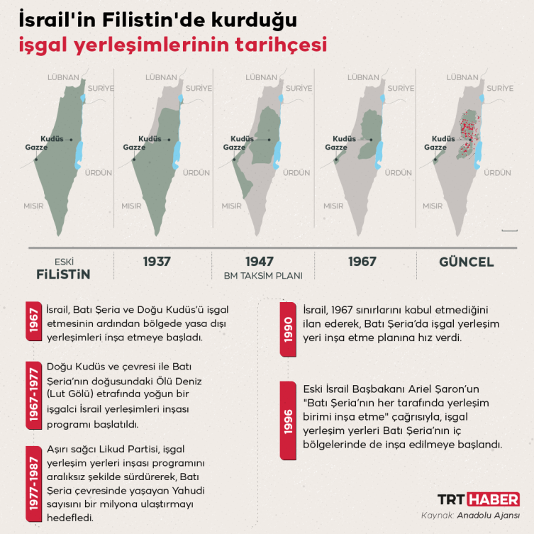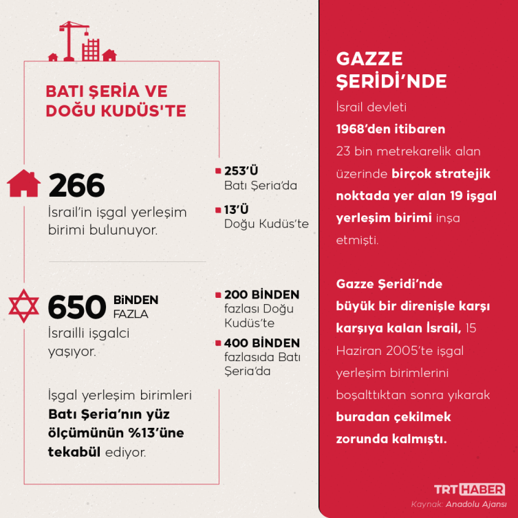 İsrail’in Batı Şeria ve Doğu Kudüs’ü işgal ettiği 1967'de, bölgede tek bir Yahudi işgalci bile bulunmazken, bugün 230 bini Doğu Kudüs’te olmak üzere 650 bin Yahudi işgalci yaşıyor.