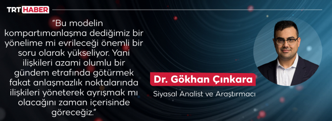 Bu modelin kompartımanlaşma dediğimiz bir yönelime mi evrileceği önemli bir soru olarak yükseliyor. Yani ilişkileri azami olumlu bir gündem etrafında götürmek temel amaç oluyor. Eğer anlaşmazlık noktaları olursa bunları da krize dönmeden yönetebiliyorsunuz. İki başkent bunu ne kadar başarabilecek zaman içerisinde göreceğiz.”