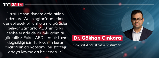 İsrail ile son dönemlerde atılan adımlara Washington'dan erken denebilecek bir dizi olumlu görüşler geliyor. Bunun en somut örneği Washington Büyükelçisi Murat Mercan'ın ne düşündüğünü ana akımdan birçok elit merak etmeye başladı. Zamanla ABD’nin farklı cephelerinde de olumlu adımlar görebiliriz. Fakat ABD'den bir tavır değişikliği için Türkiye'nin karar alıcılarının da kapsamlı bir strateji ortaya koymaları beklenebilir.