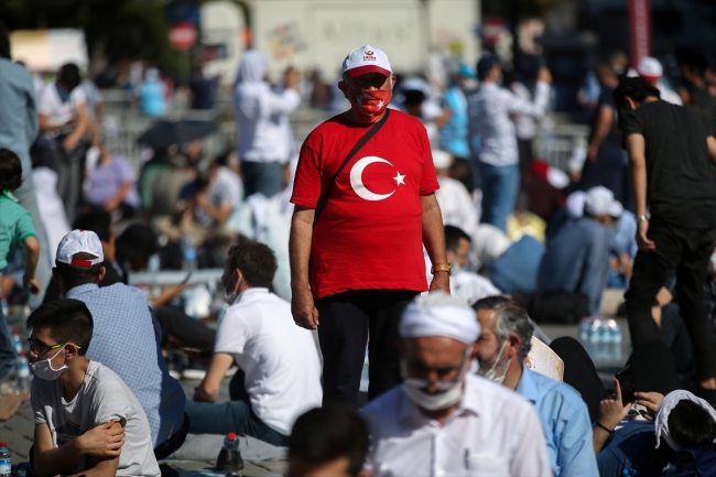 İstanbul Valiliği tarafından, kadınlar ve erkekler için ayrılan namaz kılma alanlarının duyurusu yapılıyor. Vatandaşlar, seccadeleri üzerinde namaz saatini beklerken, alandaki görevlilerce de su dağıtılıyor.