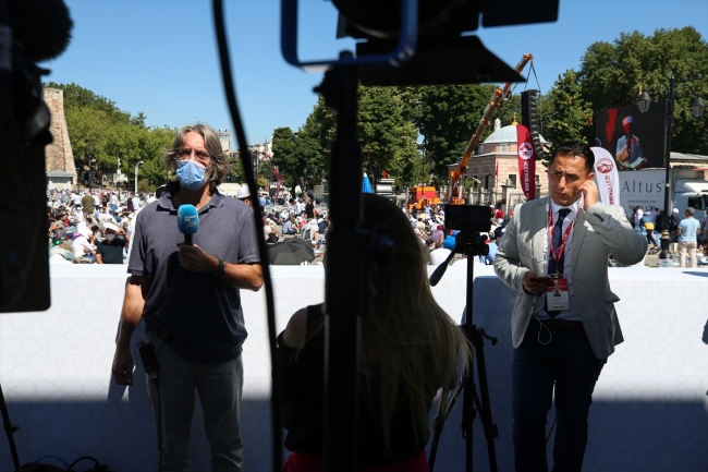 Açılışı takip etmek isteyen basın mensupları için Ayasofya Meydanı'nda yapılan iki katlı bir platformda da çok sayıda yerli ve yabancı gazeteci görev yapıyor.