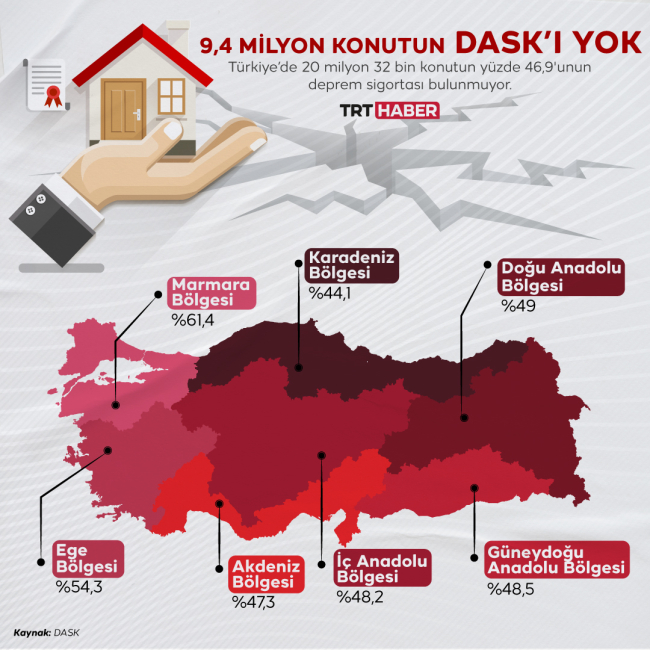 Ancak yıkıcı depremler korkutsa da DASK’a olan ilgi yine kentsel dönüşüm gibi istenilen seviyede değil… Ülke genelindeki 20 milyon 32 bin konutun yüzde 46,9'unun deprem sigortası yok. Bu rakam, 9 milyon 389 bin 355 konutun sigortasının olmadığı anlamına geliyor.
