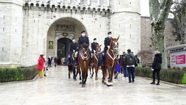 Atlı Jandarma Timlerimizin Topkapı Sarayı’nın taşlı yollarında icra ettiği bu devriyeler esnasında atlarımızın çıkardıkları nal sesleri ziyaretçilerin geçmişe kısa bir yolculuk yapmasını sağlıyor.”