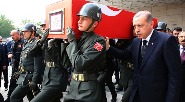Cumhurbaşkanı Erdoğan ve Başbakan Yıldırım, top arabasına kadar Türk bayrağına sarılı naaşa eşlik etti.