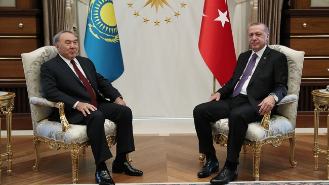 Heyetlerin takdiminin ardından, merdivenlerde ülkelerinin bayrakları önünde tokalaşarak gazetecilere poz veren Erdoğan ve Nazarbayev daha sonra baş başa görüşmeye geçti.