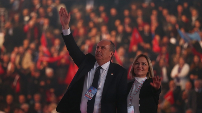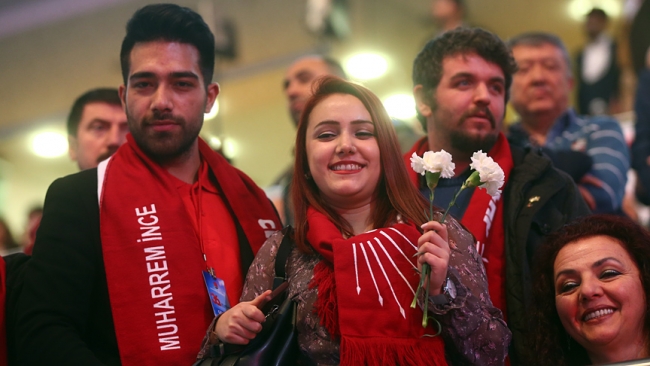 İnce ve eşi Ülkü İnce salonun ortasında kurulan platformda yürüyerek partilileri selamladı. Tribündeki bazı partililerin İnce'ye karanfil attığı görüldü.