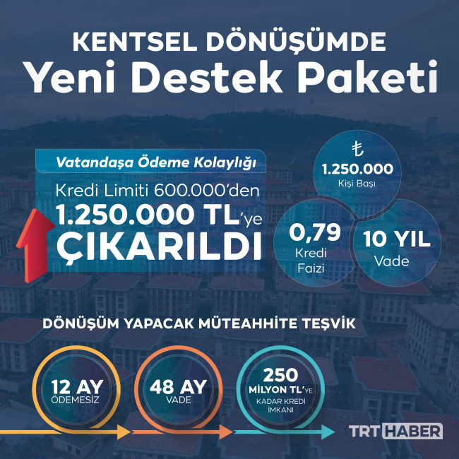 Bu kapsamda; Riskli alanlarda yer alan ya da kendisi riskli yapıların malikleri için 2. Kentsel dönüşüm kapsamında yüklenici ve konut üreticileri için destek paketleri hazırladık. Çevre, Şehircilik ve İklim Değişikliği Bakanlığımızla eşgüdüm içerisinde maliklere yönelik sunduğumuz finansman paketi kapsamında kişi başı 1 milyon 250 bin liraya kadar finansman imkanı sunuyor ve finansman maliyetinin 840 baz puana kadarlık kısmını karşılıyoruz. Paket ile vatandaşlarımızın yaşam şartlarını iyileştirmeleri için önemli bir kolaylık daha sunmuş oluyoruz.