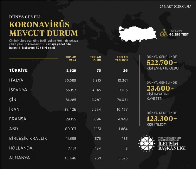 İletişim Başkanlığının Twitter hesabından, Çin'in Hubey eyaletine bağlı Wuhan kentinde ortaya çıkan yeni tip koronavirüsün (Kovid-19) dünya genelinde ulaştığı rakamlar paylaşıldı.