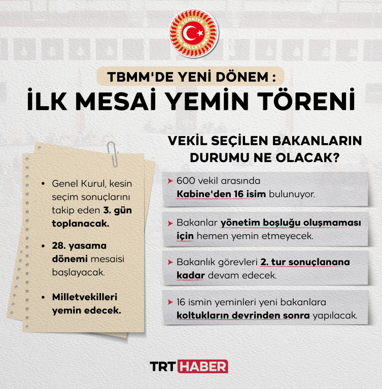 14 Mayıs'ta milletvekili seçimi ile parlamento da yenilendi. Türkiye Büyük Millet Meclisi'nin 28'inci yasama dönemi takvimi yemin töreni ile işlemeye başlayacak.