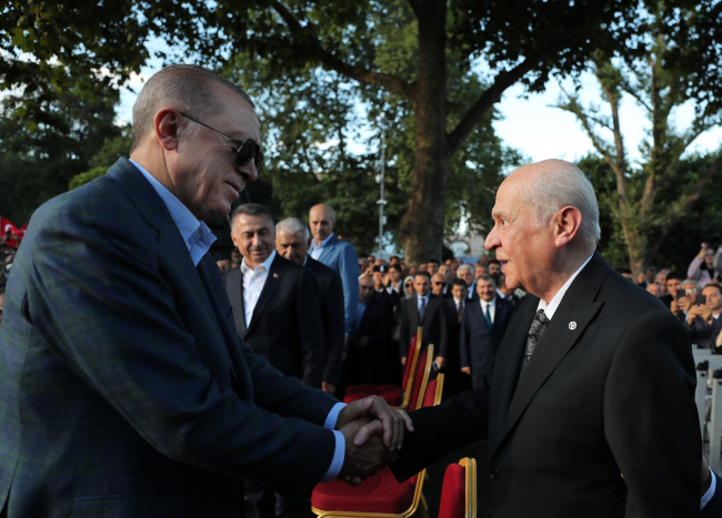 MHP Genel Başkanı Devlet Bahçeli, Cumhurbaşkanlığı İletişim Başkanlığınca Saraçhane Meydanı'nda düzenlenen "15 Temmuz Demokrasi ve Milli Birlik Günü Anma Programı"ndaki konuşmasına şehitlere Allah'tan rahmet dileyerek başladı.
