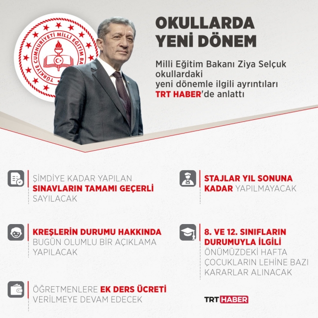 Milli Eğitim Bakanı: Okulları uzaktan eğitime yönlendirmişken sınav yapmamız doğru değildi. Bu erteleme salgının seyrine bağlı olarak 4 Ocak sonrası, ne şekilde olacak bunla ilgili tarihleri belirledik. Şimdiye kadar yapılan sınavlar geçerli sayılacak. https://t.co/jYaGfvNiUK pic.twitter.com/pwBIvmPeMH
