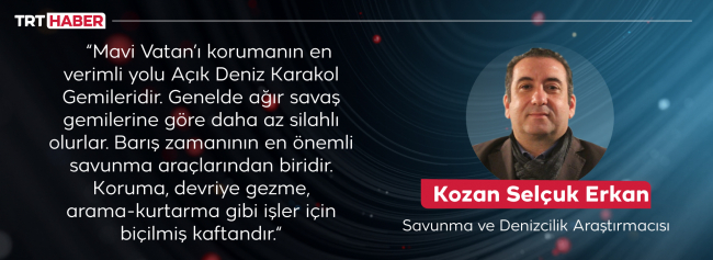 Mavi Vatan’ı korumanın en verimli yolu Açık Deniz Karakol gemileridir. Genelde ağır savaş gemilerine göre daha az silahlı olurlar. Barış zamanının en önemli savunma araçlarından biridir. Saldırıdan ziyade koruma amacı güttüğü için tahrik ederek değil aksine bayrağını göstererek işlerini tamamlar. Koruma, devriye gezme, arama-kurtarma gibi işler için biçilmiş kaftandır.