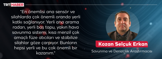 “Bu gemiler dünyadaki örneklerine göre iyi derecede silahlılar… En önemlisi ana sensör ve silahlarda çok önemli oranda yerli katkı sağlanıyor. Yerli ana arama radarı, yerli baş topu, yakın hava savunma sistemi, kısa menzil çok amaçlı füze atıcıları ve stabilize silahlar göze çarpıyor. Bunların hepsi yerli ve bu çok önemli bir kazanım.