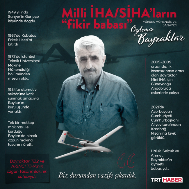 Milli SİHA'ların öncü ismi, girişimci, yüksek mühendis ve sanayici Özdemir Bayraktar, 1949 yılında Sarıyer’in Garipçe köyünde doğdu. Kabataş Erkek Lisesi’nden mezun oldu.
