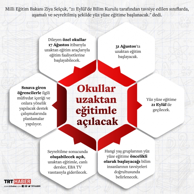 "Buna göre 31 Ağustos 2020 tarihinde okulları uzaktan eğitimle açıyoruz ve öğretim yılımıza da bu şekilde başlamış oluyoruz. 21 Eylül'de Bilim Kurulu tarafından tavsiye edilen sınıflarda aşamalı ve seyreltilmiş şekilde yüz yüze eğitimin de başlamasına karar vermiş bulunuyoruz. Dileyen özel okullar tabii ki 17 Ağustos Pazartesi gününden itibaren uzaktan eğitim araçlarıyla eğitim faaliyetlerine başlayabilecek. Yüz yüze eğitim alamayan öğrenciler eğitimlerine uzaktan eğitim araçlarıyla devam edecekler. Uzaktan eğitim araçları, kendi kademelerine uygun içerikler çerçevesinde EBA televizyon kanalları, kendi öğretmenleriyle yaptıkları canlı dersler ve bu derslerin devamında EBA internetin içeriğindeki bir takım konulardan da oluşuyor."