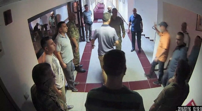 Darbe girişiminin bastırılmasının ardından sivil turuncu tişörtle karargaha gelen Aksakallı'nın darbecilerin tutulduğu odaya girdiği, bir müddet burada kalmasının ardından çıktığı görülüyor.