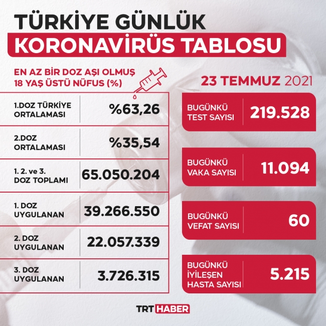 18 yaş üstü nüfusta birinci doz aşı uygulananların oranı yüzde 63,26, ikinci doz aşı uygulananların oranı yüzde 35,54 olarak gerçekleşti.