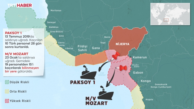 [Söz konusu bölge farklı risk seviyelerde riskler içeriyor. Mozart gemisine saldırılan yer ile Paksoy-1 gemisine saldırılan yer oldukça yakın. Info Grafik: Bedra Nur Aygün - TRT Haber.]Tüm bunlar yaşanırken hemen herkesin aklında benzer sorular vardı… Nasıl oluyor da teknelerle yanaşan haydutlar dev gemiyi teslim alıyordu, bölgede bu olayların sıklıkla yaşandığı bilinmesine rağmen neden herhangi bir koruma yoktu? Daha da önemlisi kaçırılan 15 personel için nasıl bir süreç işleyecekti?