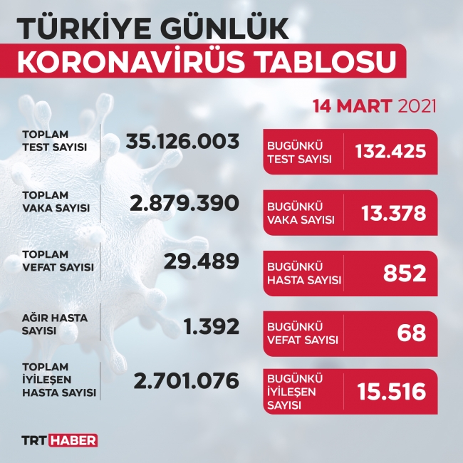 Buna göre, son 24 saatte 132 bin 425 COVID-19 testi yapıldı, 13 bin 378 kişinin COVID-19 testi pozitif çıktı, 68 kişi yaşamını yitirdi, hasta sayısı 852 oldu.